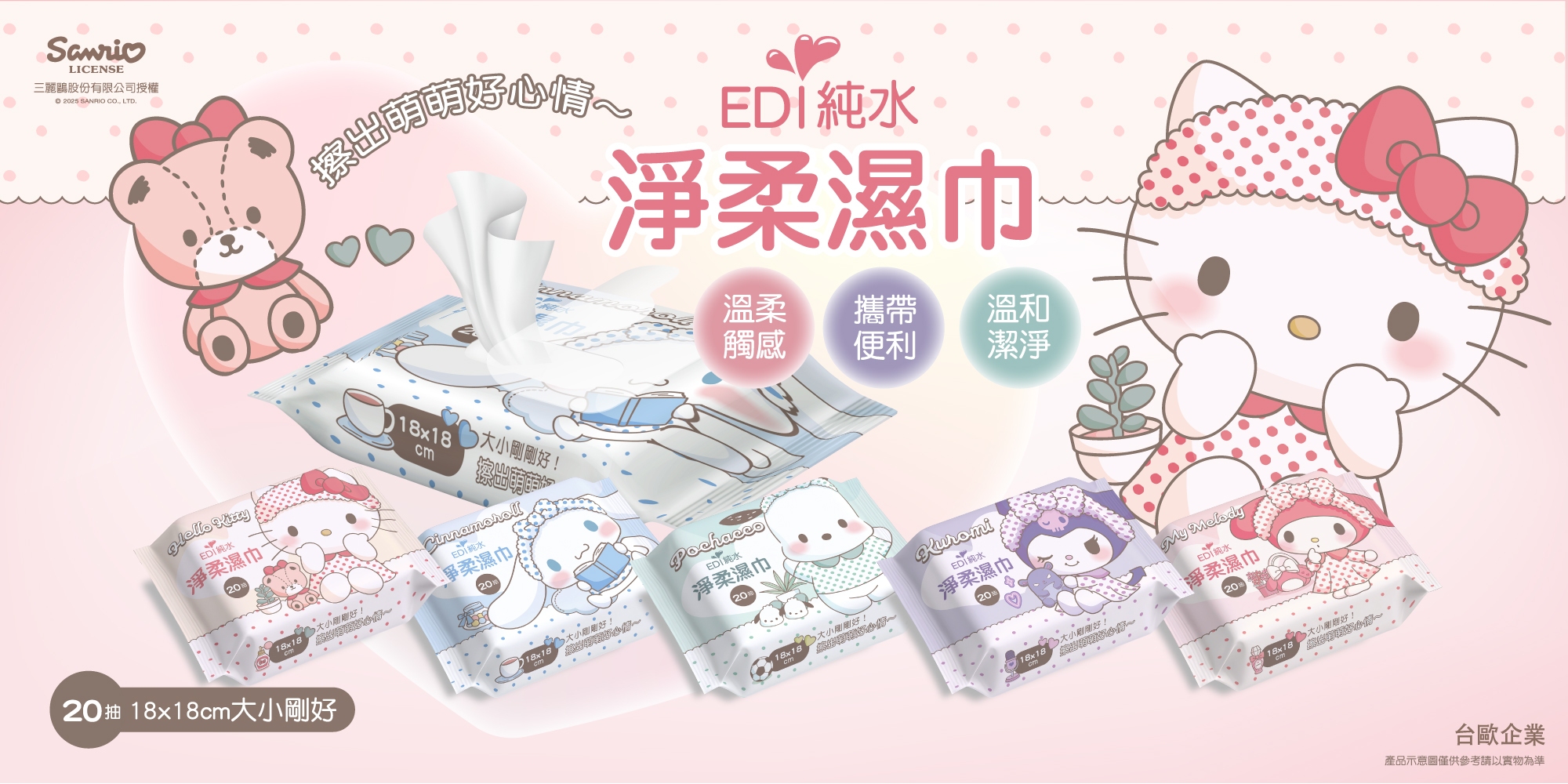 讓可愛的三麗鷗角色陪你隨時保持潔淨!這款專為外出設計的小濕巾,採用高純度EDI純水,無多餘添加,給肌膚最純粹的潔淨體驗。
