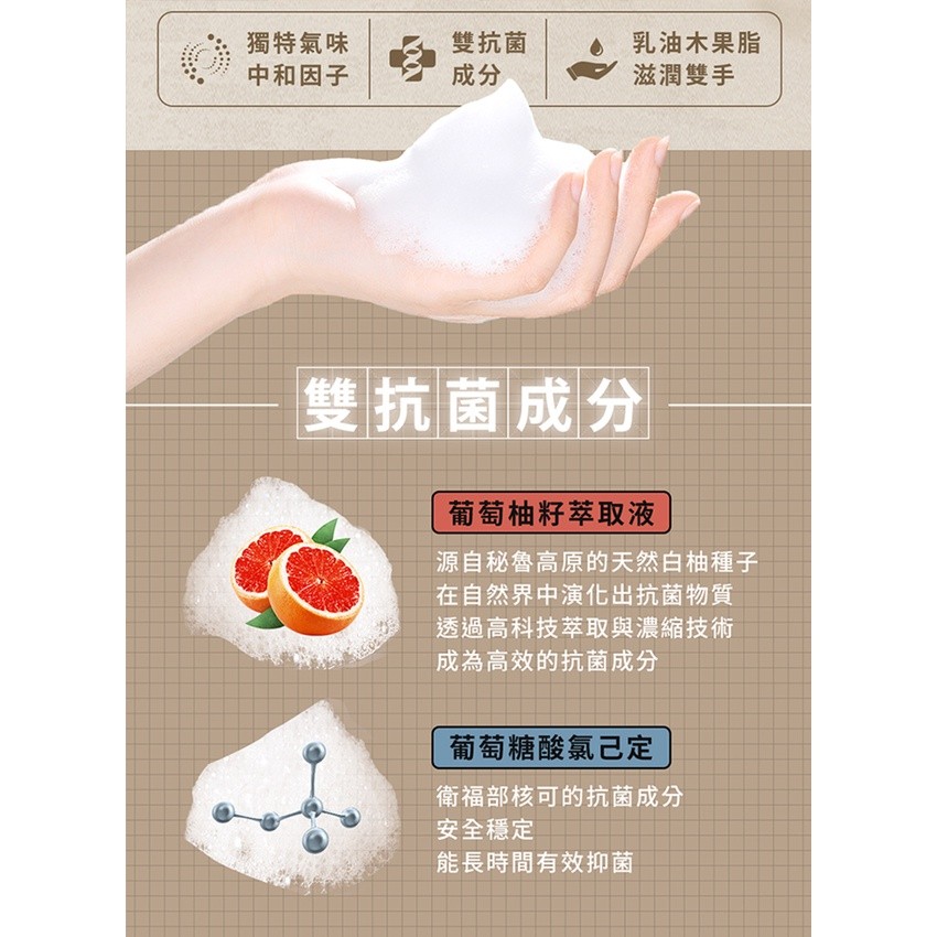 獨特氣味中和因子|雙抗菌成分|乳油木果脂滋潤雙手