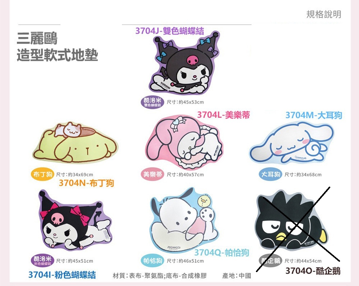 這款三麗鷗造型軟式地墊,結合了品牌人氣角色布丁狗、美樂蒂、大耳狗、蝴蝶結酷洛米、帕恰狗等多款可愛設計,是家居裝飾與實用地墊的理想選擇。