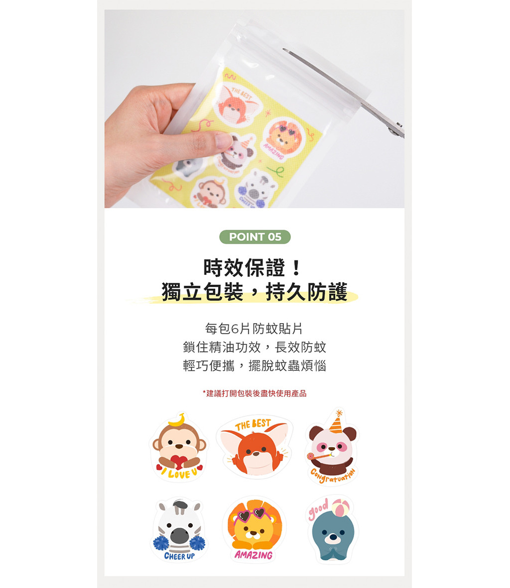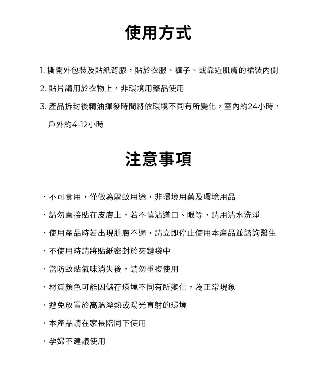🔸使用方式:撕掉貼紙背膠,將貼片均勻分散貼於衣物、帽子等須防蚊的位置,如蚊蟲較多的場所,可依照使用數量來增減防蚊效果